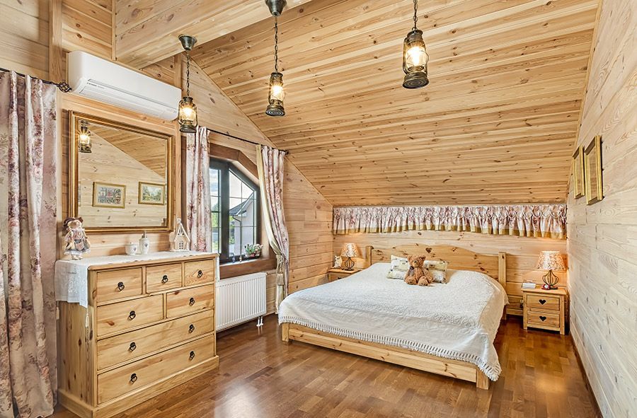 Дерево хорошо подходит для загородного интерьера. Оно сочетается с натуральной отделкой и спокойными цветами.