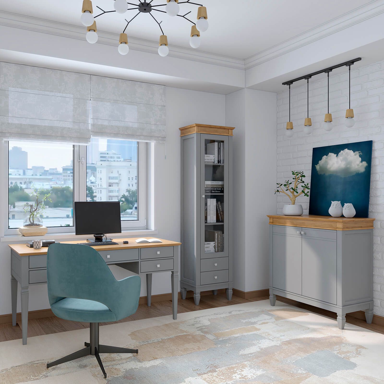 Фактура дерева, ткань, металл делают пространство живым и объёмным, не создавая ощущения захламлённости.